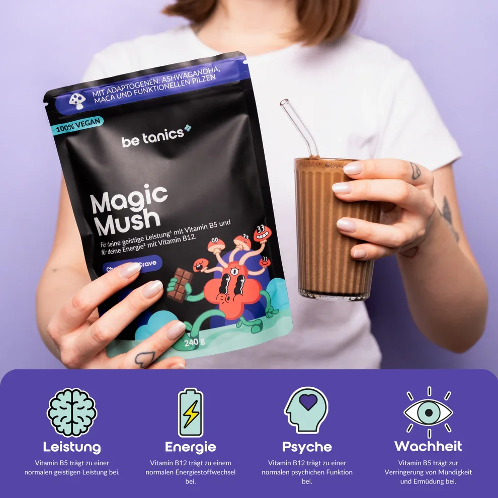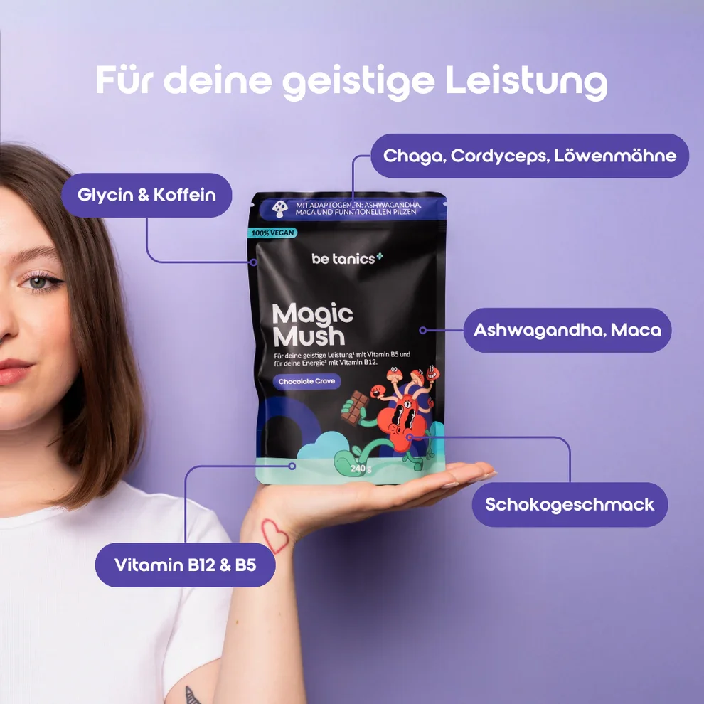 Das Bild zeigt eine junge Frau, die den adaptogenen Kakao „Magic Mush“ von be tanics präsentiert, ergänzt durch visuelle Hinweise auf seine funktionellen Inhaltsstoffe wie Chaga, Ashwagandha, Maca, Glycin, B-Vitamine und Schokogeschmack – für geistige Leistung und Energie.